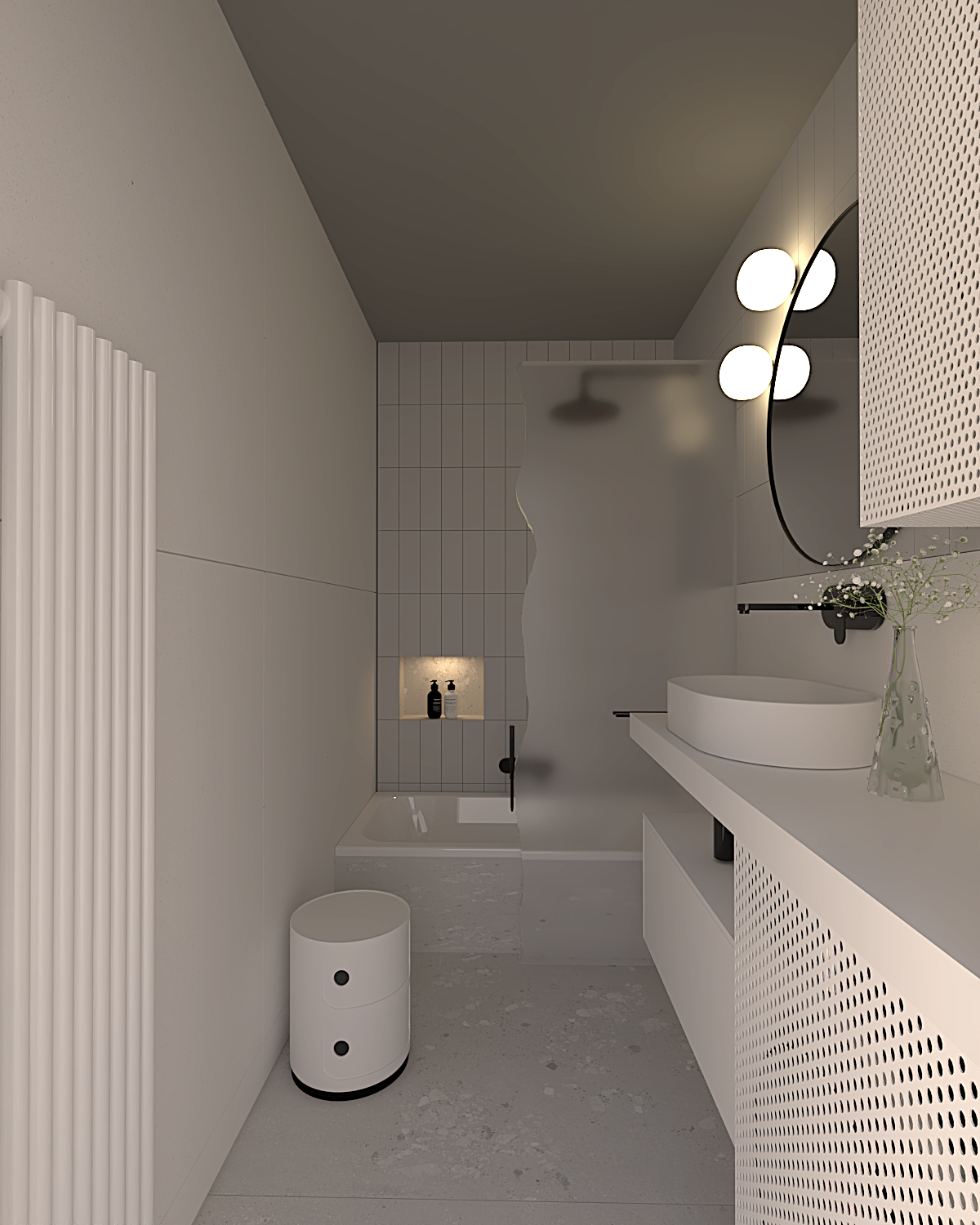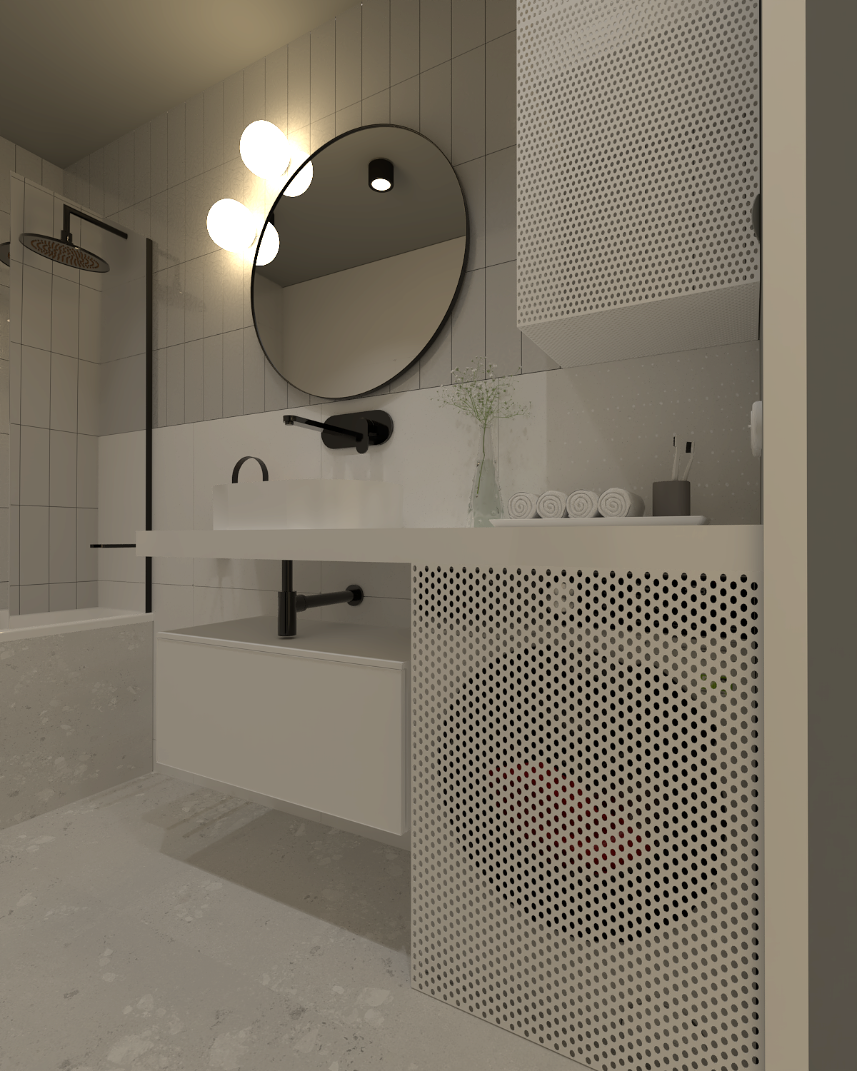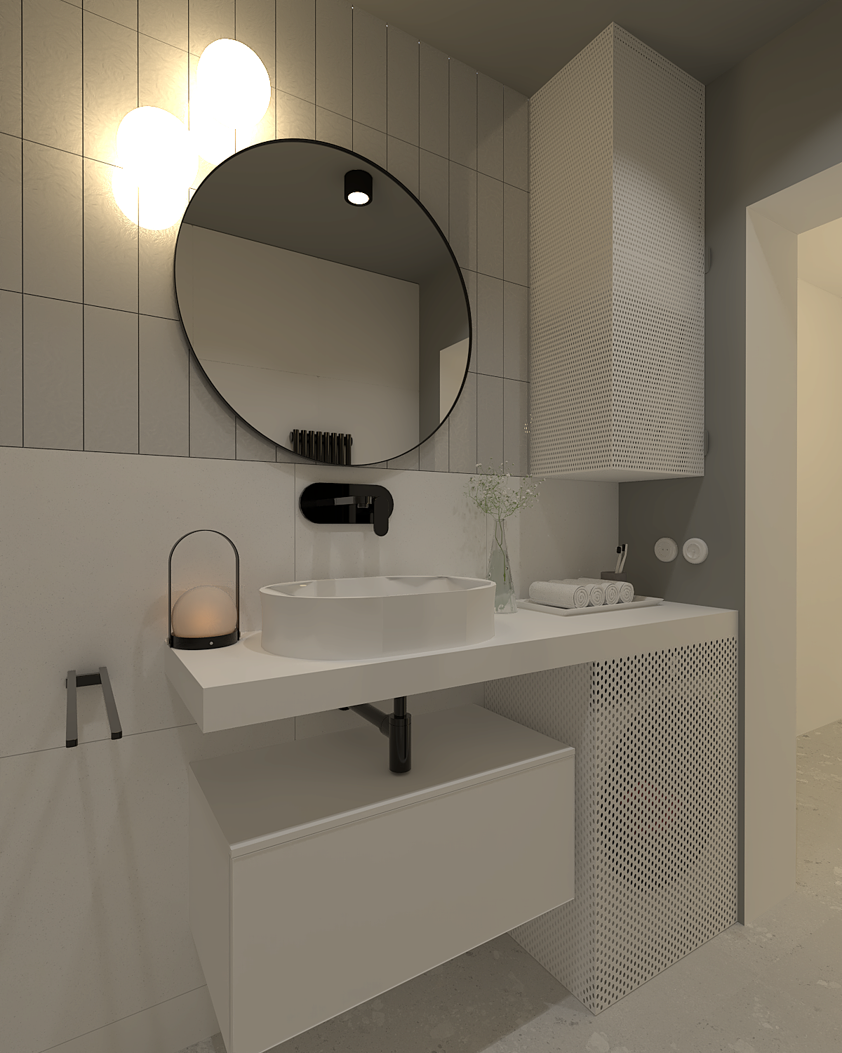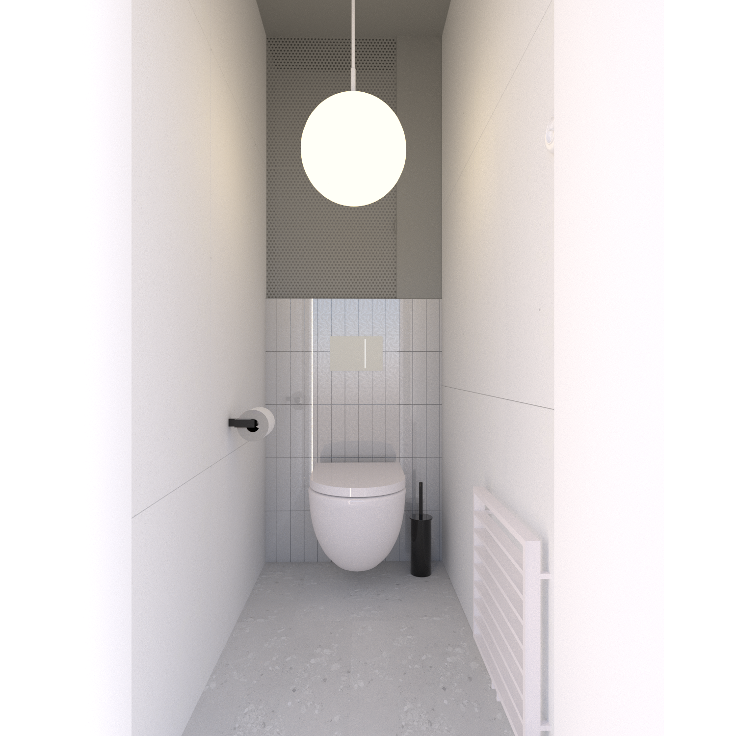 Toaleta byla navržena ve stejném duchu, přičemž jsme dbali na maximální využití prostoru a zajištění pohodlí. Kombinace bílých a šedých tónů zde opět vytváří harmonický a uklidňující efekt. Moderní úložné systémy za perforovanými dvířky pak poskytují praktické řešení pro uskladnění potřebných věcí.